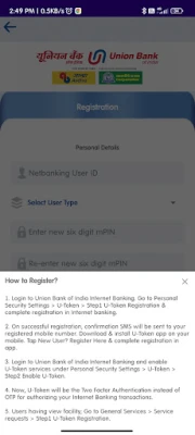 1. Login to Union Bank of India Internet Banking. Go to Personal Security Settings > U-Token > Step1 U-Token Registration & complete registration in Internet banking.