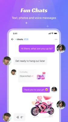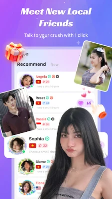 Bạn có thể tìm thấy nhiều người bạn mới thú vị với những bức ảnh thật đã được xác minh của họ tại đây. Bạn có thể dễ dàng kết nối chỉ bằng một cú nhấp chuột để chào hỏi và bắt đầu cuộc trò chuyện vui vẻ bằng tin nhắn văn bản, tin nhắn thoại, ảnh, biểu tượng cảm xúc và quà tặng ảo.