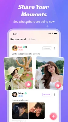 Chia sẻ những khoảnh khắc thú vị trong cuộc sống của bạn bằng video và hình ảnh để thể hiện bản thân. Thể hiện sự đánh giá cao của bạn bằng cách giơ ngón tay cái lên, khám phá và tận hưởng những cập nhật của người khác. Ngoài ra, tính năng theo dõi cho phép bạn cập nhật thông tin với bạn bè, đảm bảo bạn không bao giờ bỏ lỡ những cuộc phiêu lưu thú vị và niềm vui hàng ngày của họ.