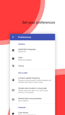 Language, Units, Light/Dark theme, Location update frequency, Default alarm area perimeter etc.