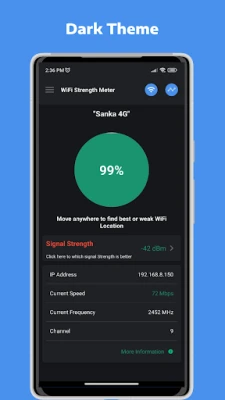 With the WiFi Signal Strength Meter, you can view real-time WiFi signal strength and detailed information about your WiFi network. Its intuitive interface makes it easy to detect strong WiFi signals nearby and identify weak spots in your current connection.