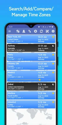 World time zones converter clock is a zone calculator, zone map app. Time Zone Converter help to search and add your desired time zones in the list. Time Zones Converter - World Clock Time Now App also have a compass and speed meter. Compass helps to search and find your direction and shows degrees from north. The speed meter is an awesome over speed checking tool. Speed meter show your current speed, average speed, maximum speed, time and distance traveled.