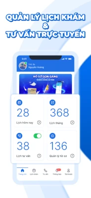 Chủ động quản lý lịch khám: với mục tiêu giảm thiểu các thủ tục rườm rà, Bác Sĩ có thể chủ động quản lý lịch khám ngay tại ứng dụng. Lịch khám luôn được thống kê trực quan trên màn hình điện thoại, Bác Sĩ có thể kiểm tra lịch theo ngày, tuần, tháng hoặc bất cứ lúc nào.