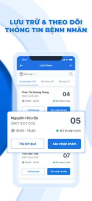 Lưu trữ và theo dõi hồ sơ bệnh nhân: với tính năng này hồ sơ bệnh nhân được lưu trữ tự động, Bác Sĩ không mất nhiều thời gian để quản lý hồ sơ, các loại giấy tờ hay file excel.