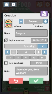 Add products to your food inventory in just a few clicks, specifying essential details like expiry date, name, quantity, a lovely icon, price if it's a new purchase, and much more. With over 1,000 diverse icons, you can personalize each product, enhancing your pantry and food inventory management. Every field is optional by the way.