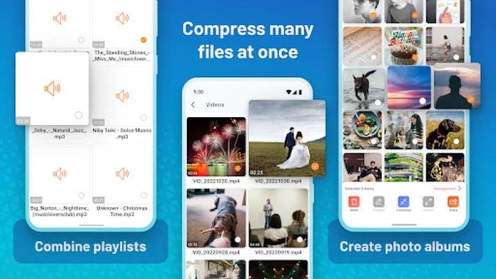 👍 Access to various file types, including DOCX, XLSX, PPTX, PDF, PNG, JPG, MP3, MP4, APK, TXT, etc., helping users compress various documents, images, videos, audios into the same convenient file for easy sending.